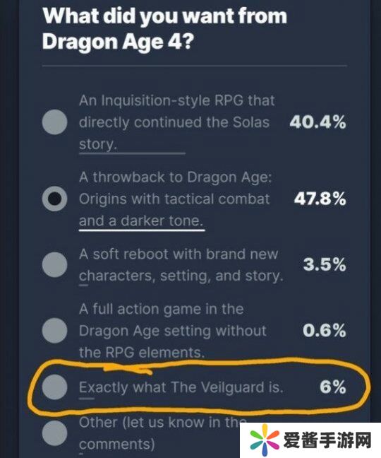 40.4%的玩家投票给“《龙腾世纪:审判》那样的RPG,延续索拉斯故事”,47.8%的玩家投票给“回归《龙腾世纪:起源》,带有战略性战斗和黑暗基调”。