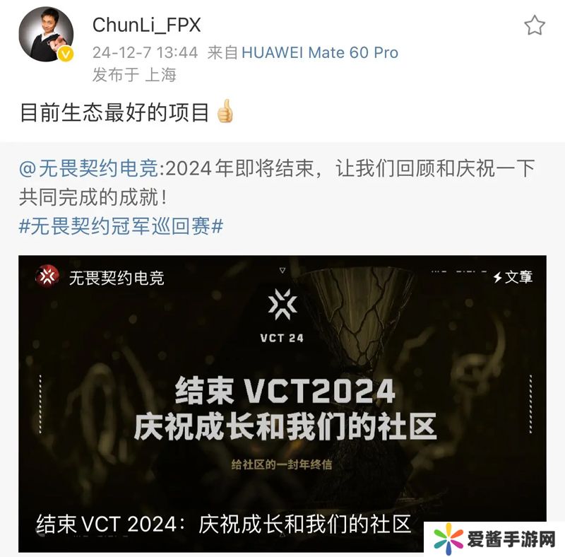 FPX老板转发无畏契约2024年年报并配文:目前生态最好的项目
