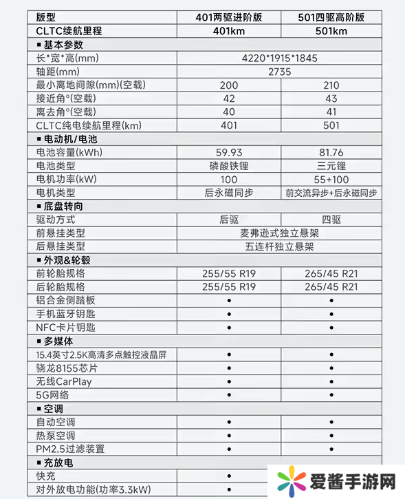 该车提供两种动力系统,一种为最大功率 100kW 的单电机,采用磷酸铁锂电池;另一种则是最大功率为 100kW+55kW 的双电机,采用三元锂电池。
