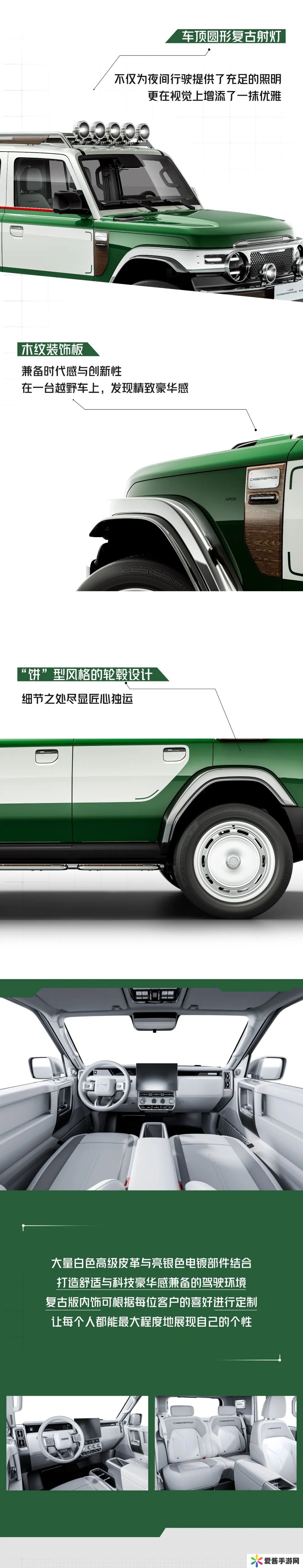 该车采用祖母绿 + 白色双拼配色,多处采用了高亮金属电镀搭配,前脸为复古圆形前大灯和格栅设计,车顶配备了同样具有复古风格的射灯。同时,该车在前后保险杠和侧踏板等细节加入木纹装饰,车侧也有大面积的木纹装饰板,并配备“大饼”形状轮毂。