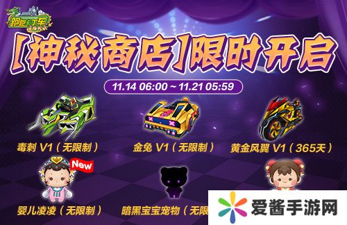 11月14日06:00至11月21日05:59期间,繁荣山丘的神秘商店再次来袭!包含“毒刺 V1(无限制)”、“金兔 V1(无限制)”、 “暗黑宝宝宠物(无限制)”等道具在内的丰富好礼,尽在神秘商店内等待车手们赢取!值得一提的是,“婴儿凌凌(无限制)”也将作为全新登场的角色在神秘商店中与大家见面哦~