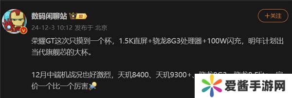 在硬件配置上,荣耀GT同样不容小觑。据爆料,该机将搭载1.5K屏幕,显示效果细腻且功耗控制得当。核心处理器方面,荣耀GT选择了骁龙8 Gen3,这款处理器以其强大的性能和出色的能效比,赢得了业界的广泛好评。荣耀GT还支持100W快充,让用户在短时间内就能充满电池,告别电量焦虑。