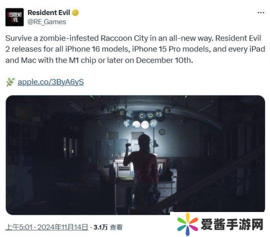 11月14日,卡普空宣布《生化危机2:重制版》的iPhone、iPad和Mac版本将于12月10日正式发售,玩家可通过App Store获得,游戏将与所有iPhone 16型号、iPhone 15 Pro型号以及所有配备M1或更高版本芯片的iPad和Mac兼容。