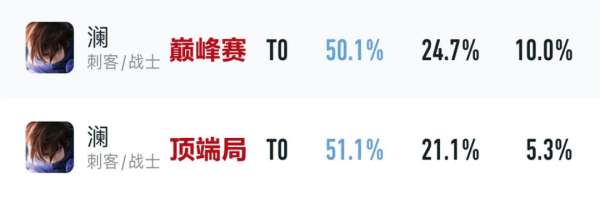 虽然出场率很低,但是巅峰赛和顶端局胜率均在52%以上,并且暃的小国标上榜战力排在打野英雄第4,证明他的机制非常适合高分段的环境。