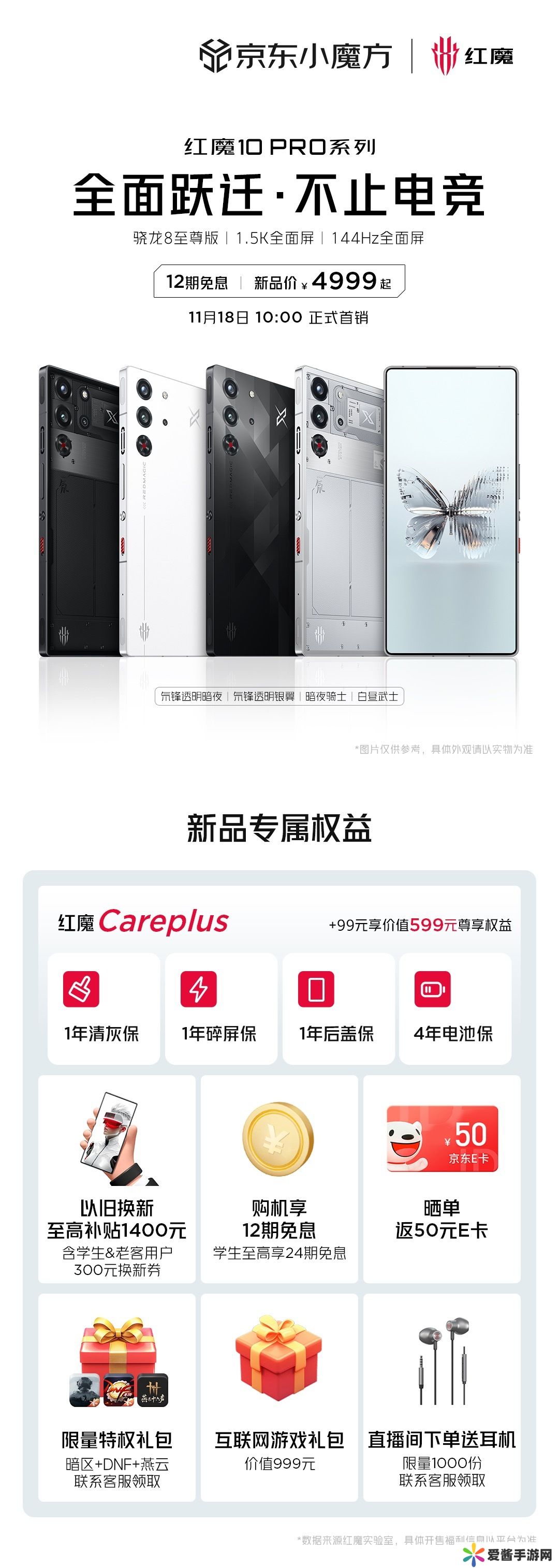 据红魔游戏手机官方消息,新机专属权益包括:红魔 Careplus:1 年清灰保 / 1 年碎屏宝 / 1 年后盖保 / 4 年电池保(该权益需 + 99 元)、以旧换新至高补贴 1400 元、购机 12 期免息(学生至高 24 期)等。