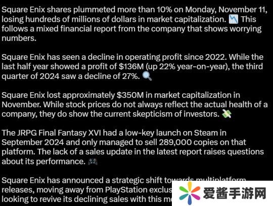 SE于2023年6月在PS5上推出《最终幻想16》后,其销量还算不错。2024年9月,该作终于登陆PC,以吸引更多玩家。然而《最终幻想16》PC版表现很差,远低于SE预期。