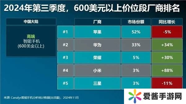 华为是苹果在高端市场的主要竞争对手,其市场份额达到33%,同比大幅增长34%,显示出强劲的市场竞争力。荣耀和小米也分别占据了5%和3%的市场份额,同比增长30%和88%,显示出国产手机品牌在高端市场的逐步崛起。三星也跻身前五,占据3%的市场份额。