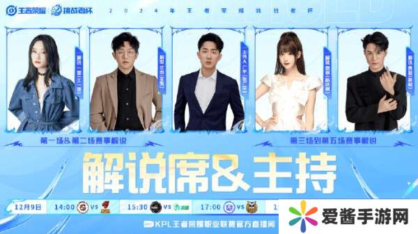 解说席&主持人:解说一雪 (王一雪)、北岛bbb (王东)、广宇有话说(张广宇)、解说琪琪 (杨泽琪)、GK黄色超人oye (黄超)