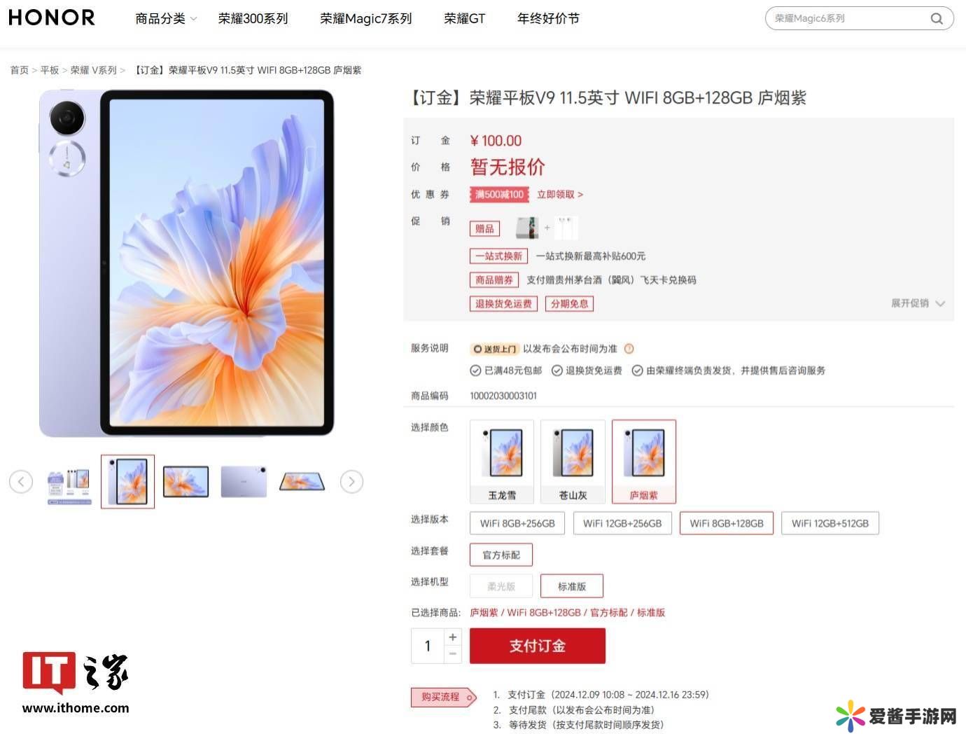 荣耀平板V9已在荣耀官网开启预约,其设计色彩丰富,包括玉龙雪、苍山灰和庐烟紫三种配色,每一种都彰显出独特的时尚感。在存储规格方面,平板将提供8GB+128GB、8GB+256GB、12GB+256GB和12GB+512GB四种配置,满足不同用户的存储需求。荣耀平板V9还将提供柔光版和标准版两种屏幕形态,为用户带来多样化的视觉体验。