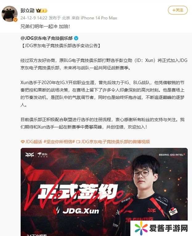 直播吧12月9日讯 今日JDG官宣打野选手Xun加盟,随后Xun转发该微博并配文:兄弟们明年一起冲 加油!