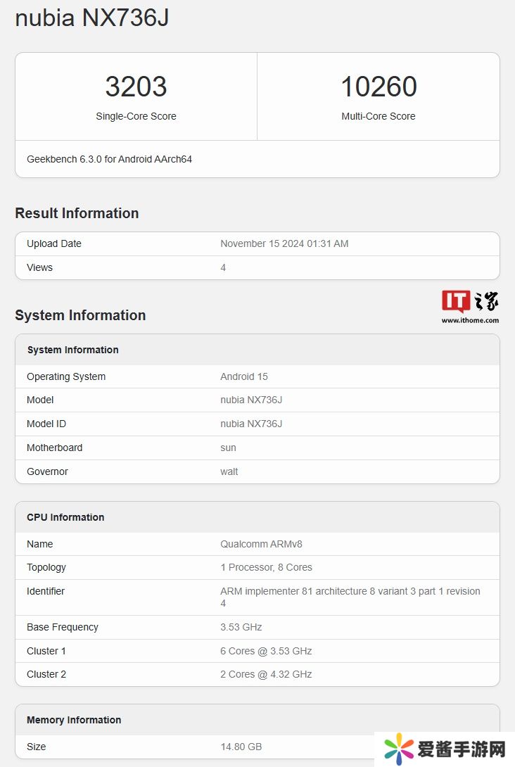 本站 11 月 17 日消息,型号为 NX736J 的努比亚新机现身 GeekBench 数据库,其单核约 3203、多核约 10260,结合此前报道,预计为努比亚Z70 Ultra 手机。