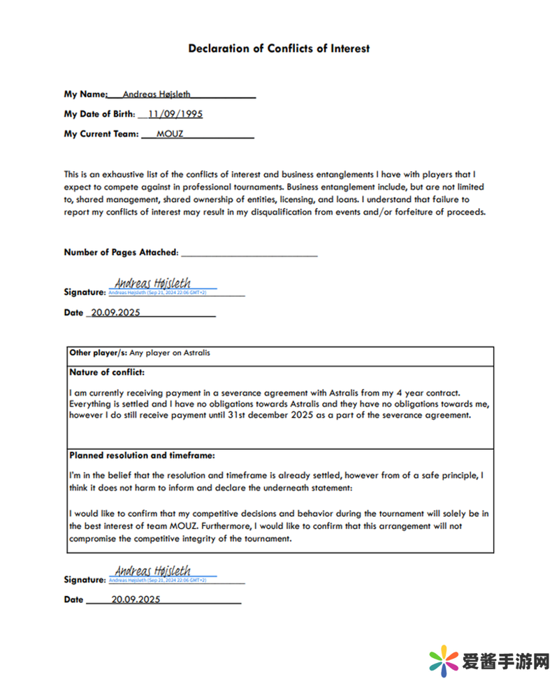 “我确认自己在比赛中的竞技决定和行为将完全符合MOUZ战队的最佳利益。此外我还想这一安排确认不会损害比赛的竞技完整性。”