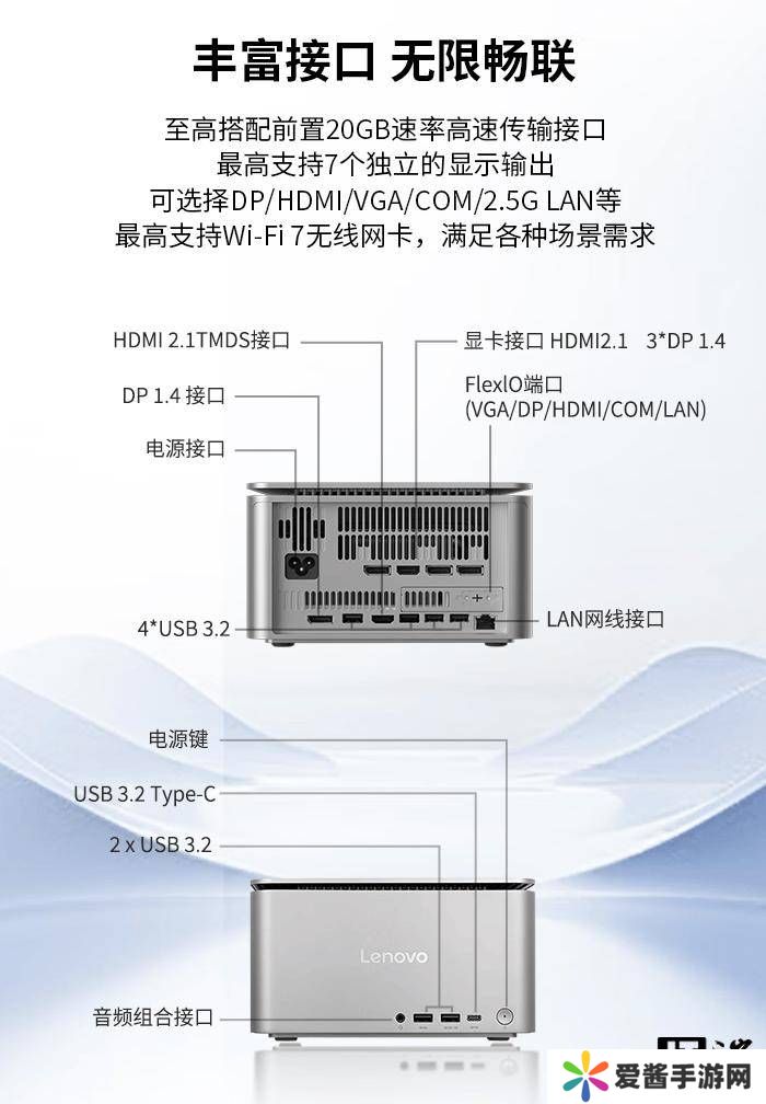 在接口方面,ThinkCentre Ultra迷你主机也提供了丰富的选择。主机正面配备了1个3.5mm音频接口、2个USB-A 3.2接口和1个USB-C 3.2接口,方便用户连接各种外设。后部则配备了2个HDMI 2.1接口、4个DP 1.4接口和4个USB-A 3.2接口,为用户提供了更多的连接选项。