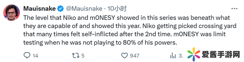 Mauisnake:NiKo和m0NESY在这个BO3中表现出的水平低于他们今年的能力和表现。NiKo在外场那么多次被击杀,感觉是对G2的二次伤害。m0NESY在没有发挥出自己80%的实力时,就已经是极限测试了。