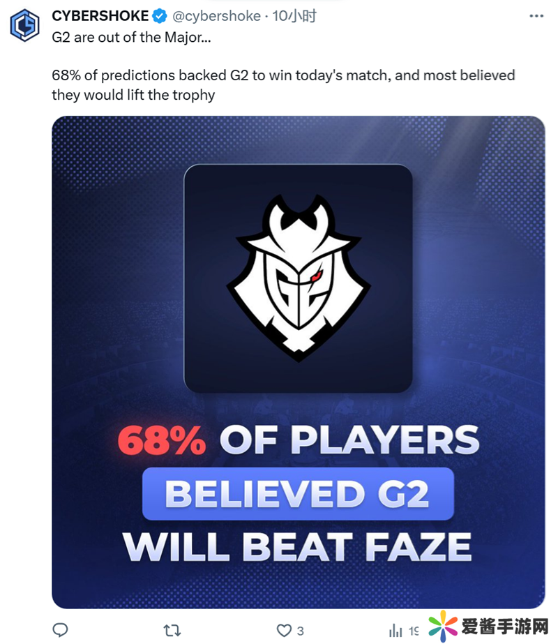 CYBERSHOKE:68%的玩家相信G2可以击败FaZe,同时相信他们能夺冠的玩家也是最多的。