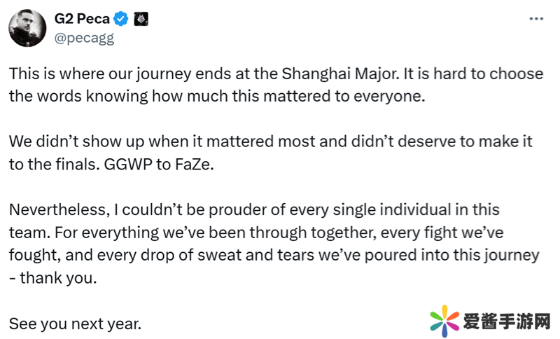 G2经理peca:我们的上海Major之旅到此结束。要知道这对每个人来说都非常重要,因此很难选择合适的词语表达感受。
