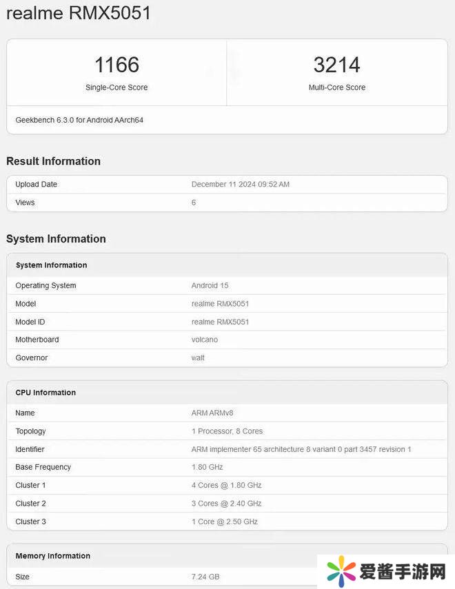 早前,GeekBench跑分库中已经出现了代号为“RMX5051”的真我新机跑分数据。数据显示,该机的单核成绩为1166分,多核成绩为3214分。处理器方面,它采用了八核架构,包括四个1.80GHz核心、三个2.40GHz核心和一个2.50GHz核心,GPU则为Adreno 810。这些参数与骁龙7s Gen3芯片相吻合,进一步证实了真我14 Pro+的硬件配置。