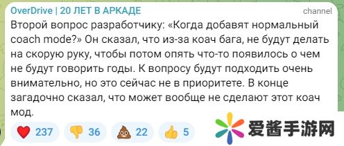 他说:“由于教练模式的BUG,他们不会急于推出,以免最终推出的功能会留下一些多年都无法解决的问题。他们会非常谨慎地处理这个问题,但目前这不是优先事项。”最后,他神秘地说:“可能根本不会加入教练模式。“