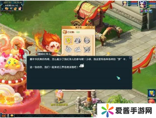 2023年12月5日12:00-2023年12月28日12:00期间,等级≥30级的少侠可以参与欢乐游园会玩法,其中欢乐集梦卡环节还有机会获得超级红孩儿。少侠们可以从长安城(235,115)超级红孩儿处领取一张随机图案的“梦卡”,消耗50点体力便可将“梦”字图案涂鸦到三界各处。