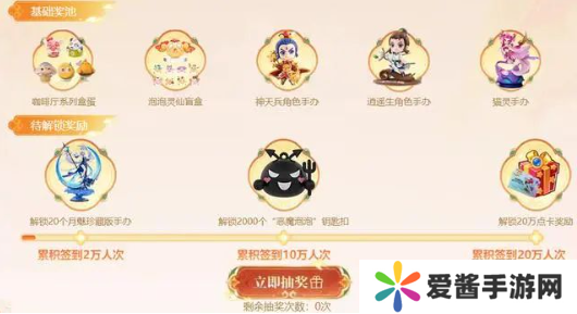 累积签到2万人次还可以解锁20个月魅珍藏版手办,累积签到10万人次可解锁2000个“恶魔泡泡”钥匙扣,累积签到20万人次可解锁20万点卡奖励。