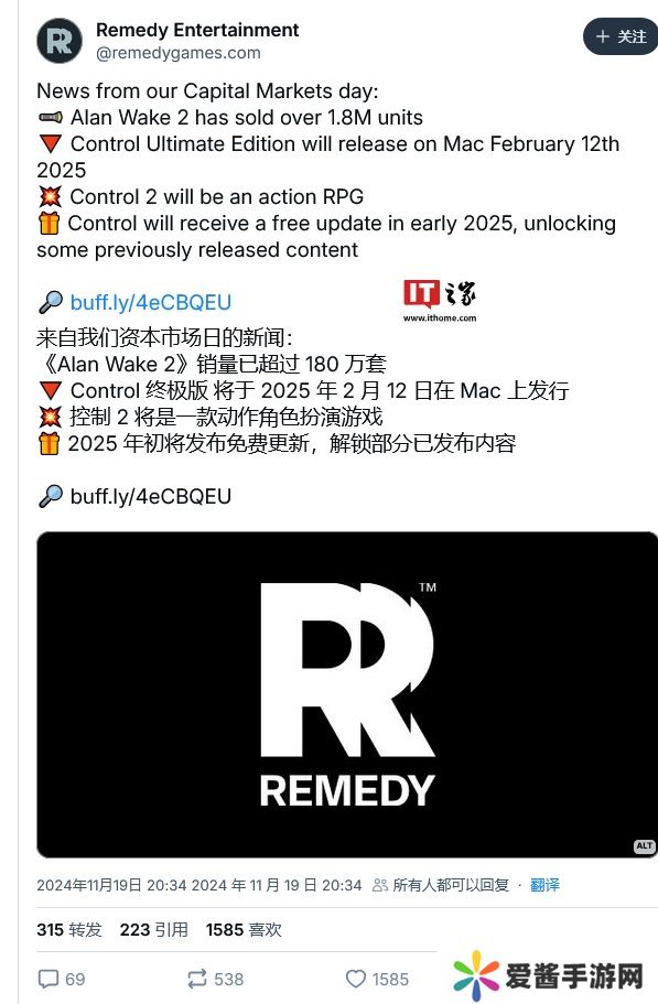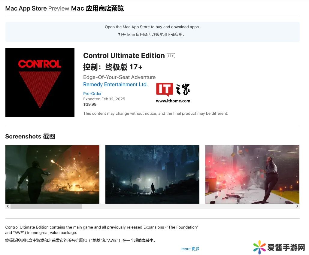 Remedy Entertainment 官方宣布,这款游戏将于 2025 年 2 月 12 日正式在苹果 Mac 平台发行,售价 39.99 美元(本站备注:当前约 289 元人民币)。