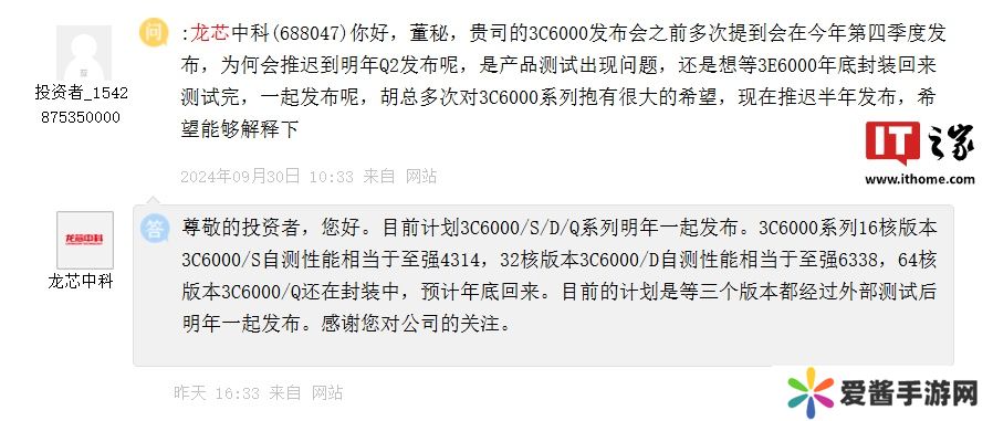 本站注意到,除 3C6000 系列处理器发布相关问题外,投资者还就龙芯 2K3000 处理器和独立显卡 9A1000 的流片情况进行提问,官方回复称:2K3000 已经于今年 6 月交付流片,预计今年能回来,后续还要经过测试、产品化等一系列工作才能上市;9A1000 计划今年底代码冻结,明年交付流片。