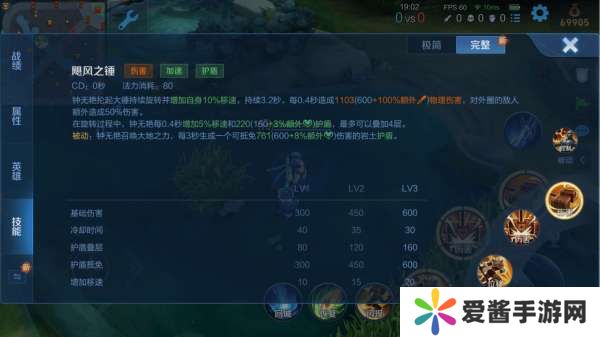 三技能叫作飓风之锤,这一招就像转呼啦圈,一边旋转一边攻击,一边提升自身移速,一边还能叠加4层护盾。