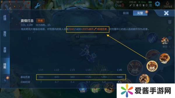 从上图我们可以看出,在技能满级+六神装的加持下,钟无艳二技能的基础伤害是1400点,加上2倍额外物理攻击力加成,一锤下去的伤害量就高达2246点!