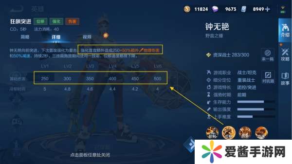 这里面有两个关键点,一是重击的基础伤害不算高,但有50%的额外AD加成,攻击力越高重击伤害越高,满级六神装的钟无艳,仅一个强化重击的伤害,就能超过700点。