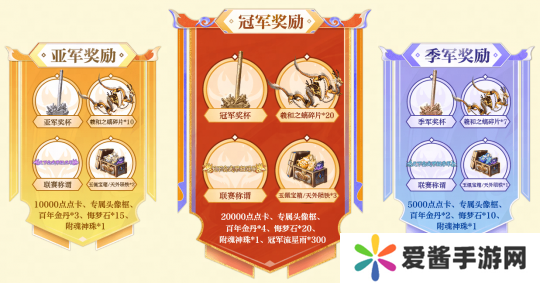 三强队伍将每人获得一座实体奖杯、点卡/玉帛、联赛称谓、联赛专属玉佩宝箱、专属头像框等奖励,更是可以获得超稀有道具奖励天外陨铁、附魂神珠。同时,《大话3经典版》的联赛64强队伍可以获得百年金丹、稀有五禽图残片礼包、百晓生的羊皮地图等高价值奖励,参赛队伍完成小组赛三战即可获得稀有五禽图残片礼包;《大话3免费版》联赛64强队伍排则可获得高级附魂礼盒、幻灵石等高价值奖励。