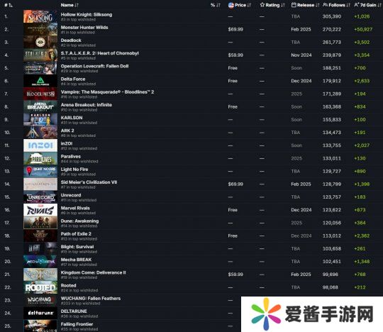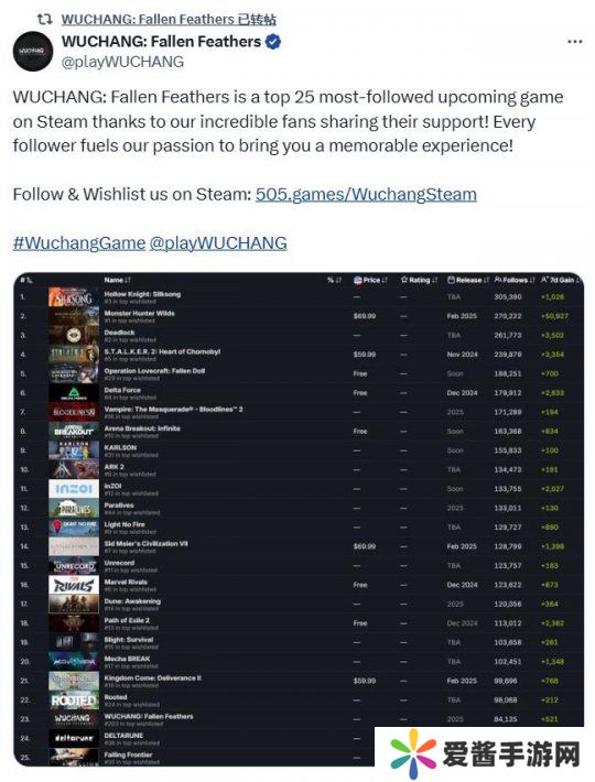 11月7日,《明末:渊虚之羽》官方发文庆祝了该作成为最受关注的即将推出的Steam游戏之一,目前《明末:渊虚之羽》在榜单中排名第23,官方也对粉丝的支持表达了感谢。