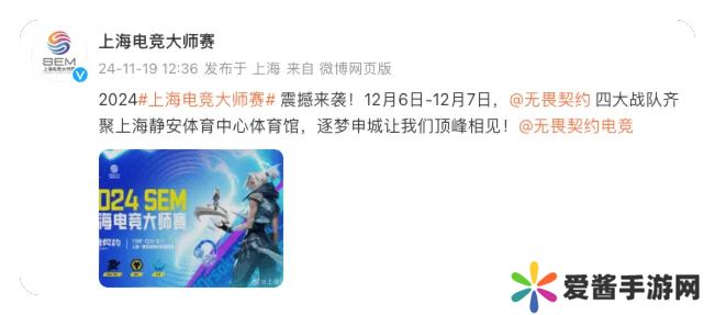 上海电竞大师赛官方宣布:本届上海电竞大师赛将于12月6日-12月7日举办。
