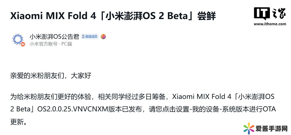 本站 11 月 19 日消息,小米澎湃 OS 今晚在小米社区发布公告,称小米 MIX Fold 4 与 MIXFlip 机型的小米澎湃 OS 2 Beta 版已发布。