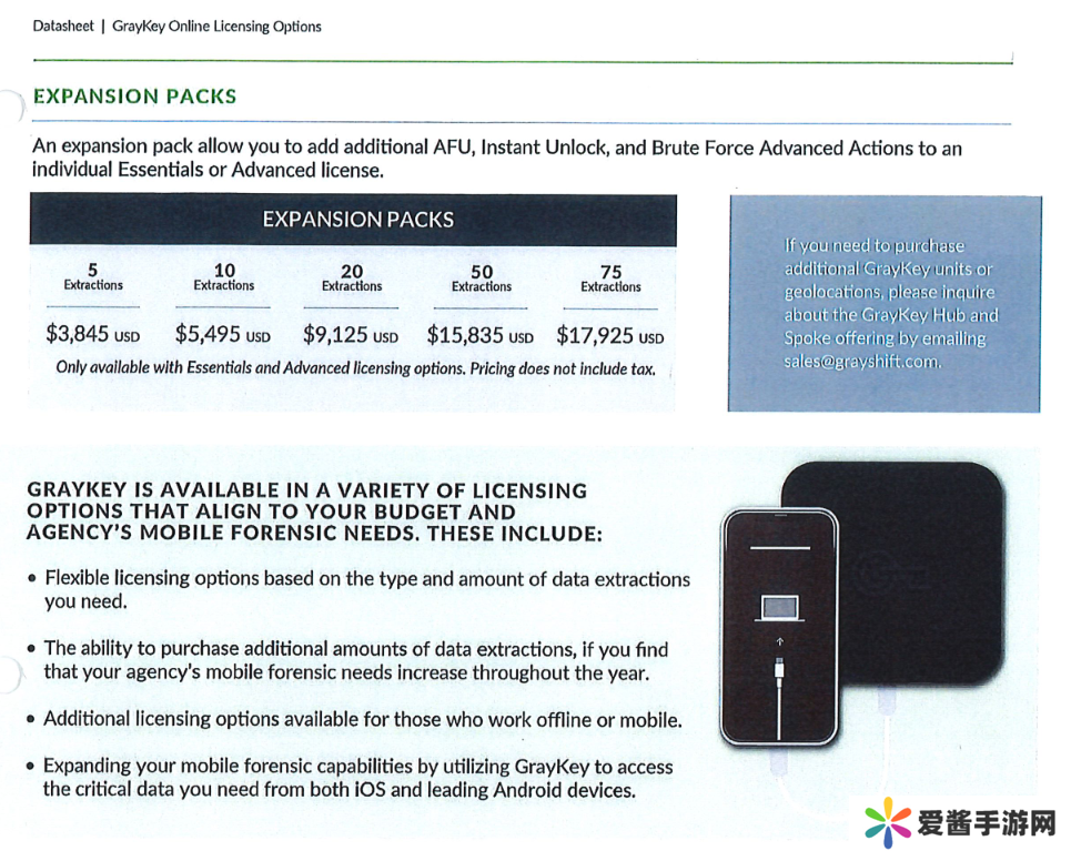 本站曾于今年 4 月报道,GrayKey 盒子破解 30 次,费用为 1.1 万美元(本站备注:当前约 79580 元人民币),可以提取目标 iPhone 上的近乎完整数据内容,而之后需要额外购买扩展包,解锁 5 次费用为 3845 美元。