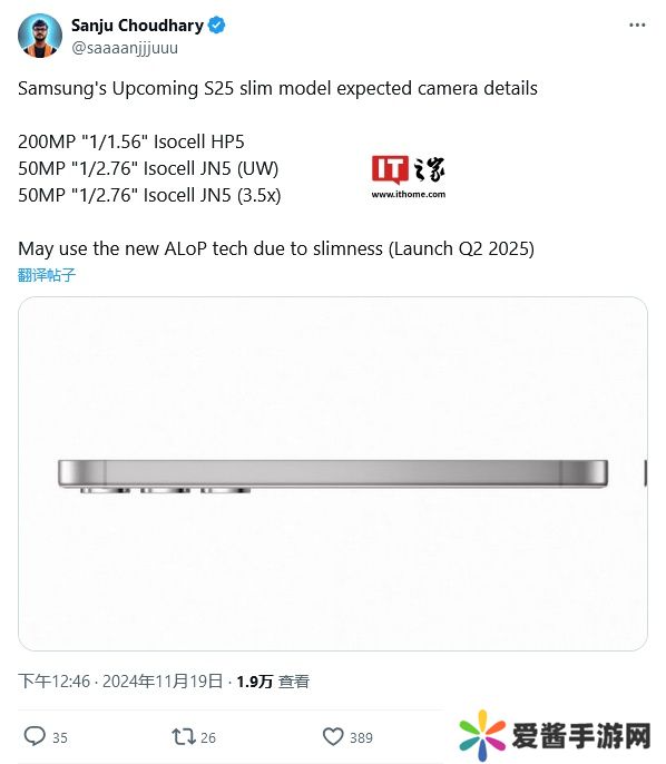 本站 11 月 20 日消息,消息源 Sanju Choudhary 昨日(11 月 19 日)在 X 平台发布推文,曝料称三星将于 2025 年第 2 季度发布 Galaxy S25 Slim 最薄旗舰手机,可能会使用最新发布的 ALoP 相机技术。
