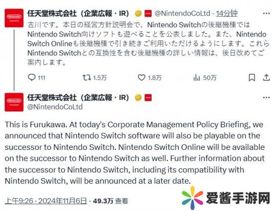 根据任天堂社长古川俊太郎通过任天堂IR官方X发布的消息,Switch继任者确定将支持向下兼容,能够游玩Switch游戏,并且Switch继任者还会继续提供Switch Online会员服务,更多Switch继任者的细节和与Switch兼容性的信息,将在稍后公布。