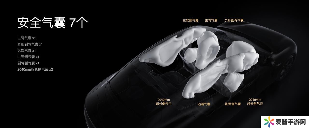 安全气囊的数量方面,小米 SU7 全系标配 7 个安全气囊,其中副驾安全气囊采用异形设计,其两侧护翼可有效避免乘员头部撞击到中控台、中控屏等硬物;长度达到 2040mm 的超长左右侧气帘还采用腔体下弯式设计,可有效避免乘员头部撞击到门板等硬物。气囊的具体位置如下: