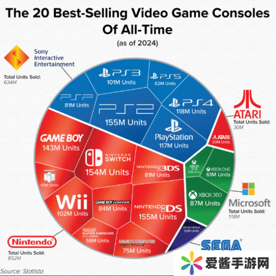 根据数据显示,任天堂主机的销量高居第一。其中,任天堂DS卖出1.55亿台、任天堂Switch卖出1.54亿台,Game Boy卖出1.43亿台,总销量为8.52亿**占鳌头。