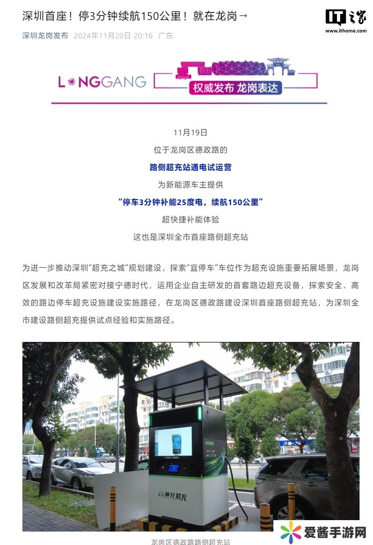 本站 11 月 20 日消息,本站从“深圳龙岗发布”公众号获悉,11 月 19 日,位于深圳龙岗区德政路的路侧超充站通电试运营,该站可为新能源车主提供“停车 3 分钟补能 25 度电,续航 150 公里”的超快捷补能体验。同时,这也是深圳全市首座路侧超充站。