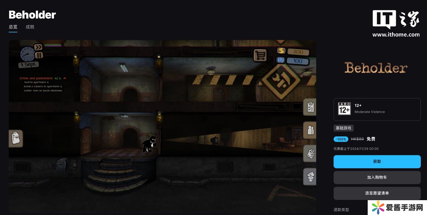 本周 Epic 送出的游戏是《观察者(Beholder)》,这是一款赛博朋克黑暗未来风格的冒险游戏,Steam 国区定价为 89 元,玩家将作为一名黑暗未来的“楼管”,必须观察你的租户,偷听他们的对话,并向上级报告他们,领取链接(点此访问)。