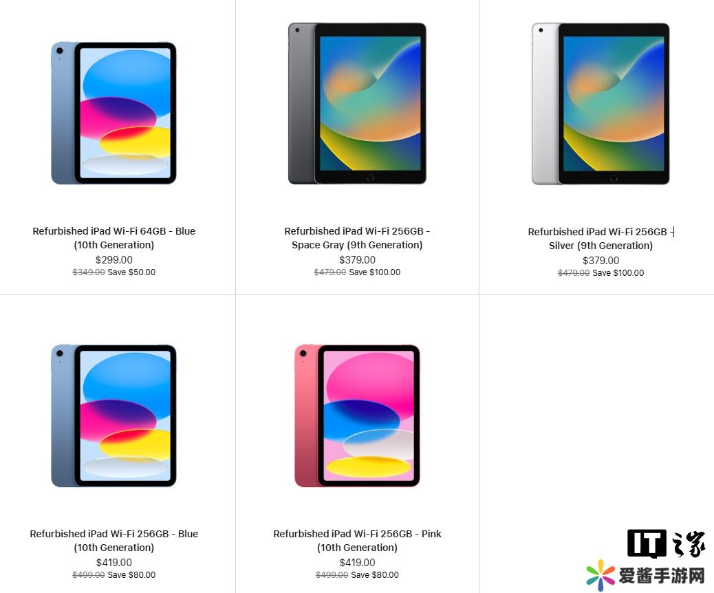 截至本站发稿,苹果中国官网翻新商店中仅有 iPad 8(2579 元)和 iPad 9(2899 元)两种型号。