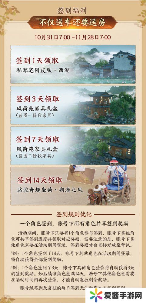 签到首日即可领取杭州西湖景区同款私邸宅园皮肤,价值120万园宅币的同主题配套绿柳清荷家具礼盒参与活动免费可得,拎包直接入住!除此以外,踏入风沙扑面的西域大世界,不如再带上“新车”吧!骆驼奇趣坐骑“朔漠之风”将踏着专属仙人掌脚印,优哉游哉,不紧不慢,陪你从容游瀚漠,驰骋西域大世界!