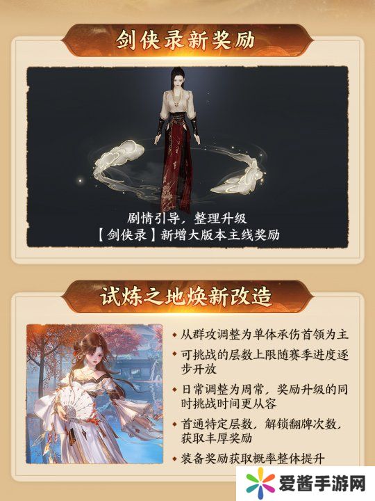 千帆过,江湖故事再添墨。为了让侠士更加清晰地探知背景故事,【剑侠录】以全新面貌与侠士再会,大版本主线奖励全面升级,精美武技殊影图和专属称号逐一登场,免费获取全民可得!试炼之地焕新改造后,保留高层关卡获取无封装备的难度(即现行PVE玩法最高难度追求)的同时,让其余各个阶段的关卡都有对应的奖励,欢迎更多侠士尝试和参与!
