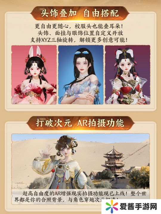打破更多桎梏,为新颖搭配提供更大的创意空间,成衣分类里的大部分帽子外观(头冠、耳朵等)将会划入新增的饰品类型【头饰】里,与外观收集里的帽子拓印相区分。与此同时,移动端AR增强现实功能正式上线,光照、倒影、横竖机位、表情动作……超高自由度,一切由你定义!
