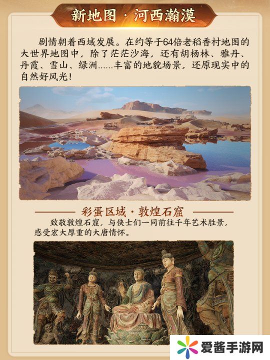携手有爱玩家及中国敦煌石窟保护研究基金会,《剑网3》为莫高窟保护性展示工程贡献了一份来自大唐侠士的力量。而在游戏内,我们也在全新西域大世界场景“河西瀚漠”中致敬敦煌石窟,为侠士们展现这背后多彩而灵动的艺术魅力与文化内涵。这里是横贯欧亚大陆的古老商道,是古代东西方贸易的桥梁,让我们一同于方寸屏幕间纵览万里风烟,塞外风韵!