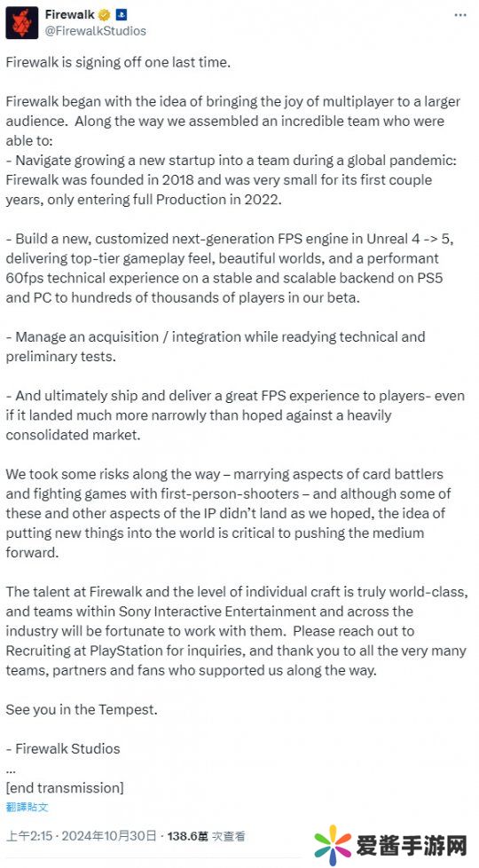 随着Firewalk工作室的解散,官方发布了长文对玩家们做出了最后的告别。可对于其中的内容,大伙依然不买账。因为这则公告的内容虽多,却并未提到《星鸣特攻》失败的原因。即便问题的答案,已经是公开的秘密。