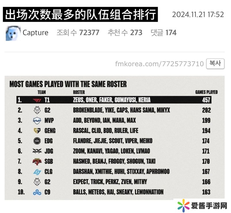 直播吧11月22日讯 近日T1官宣上单Zeus离队,这也代表着T1的五人组合ZOFGK时代的结束。同时他们也是历史上出场次数最多的五人组合,出场次数高达457场;要远高于G2阵容的202场。