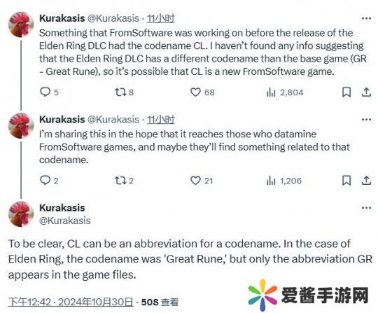另外,Kurakasis还表示他不知道这个代号具体代表什么,他分享这个信息是为了传达给FromSoftware的数据挖掘工,也许有人能找到与该代号有关的信息。最后需要说明的是,“CL”是开发代号的缩写,例如《艾尔登法环》开发代号为“GR”,全称“Great Rune”,不过在游戏文件中只出现了缩写“GR”。