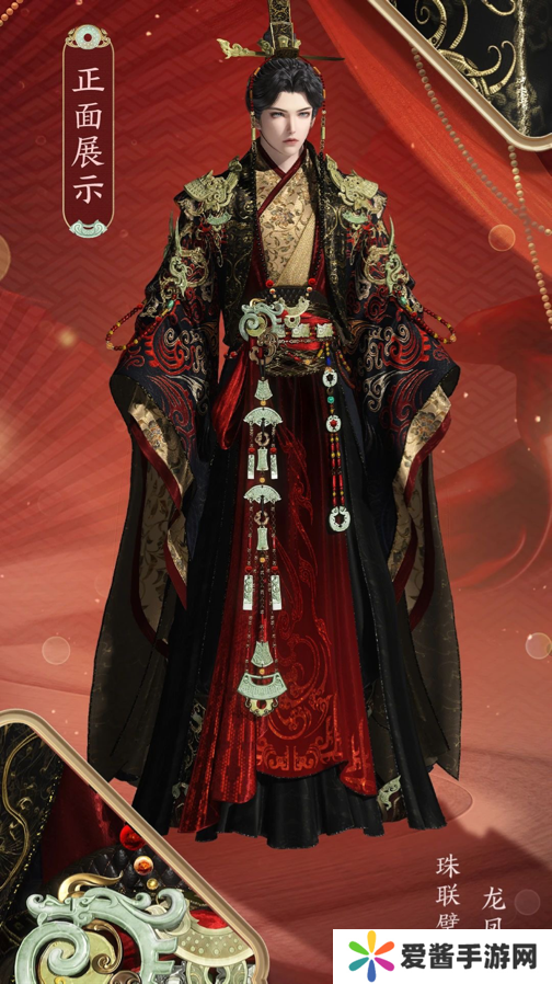 女款【珠联嘉礼】黑袍红裙,经典配色风华端庄。剪裁设计上宽袖窄腰,勾勒伊人曼妙身姿,颇有几分“战国袍”的味道。玄色华服上乘云绣样蜿蜒游走,如星辰一般熠熠生辉,通身佩戴的玉珏宝石似乎昭示了这场婚礼的盛大,腰间红绸宛如月老红线所化,与命定之人执手到老。