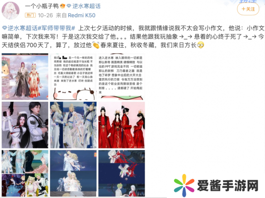 以至于活动刚开启,微博话题下秒变大型秀恩爱现场,满屏都是粉红泡泡,玩家偷师的偷师,有缘人互诉衷肠的爱情小作文也不少,随便刷一刷,都是甜蜜暴击。